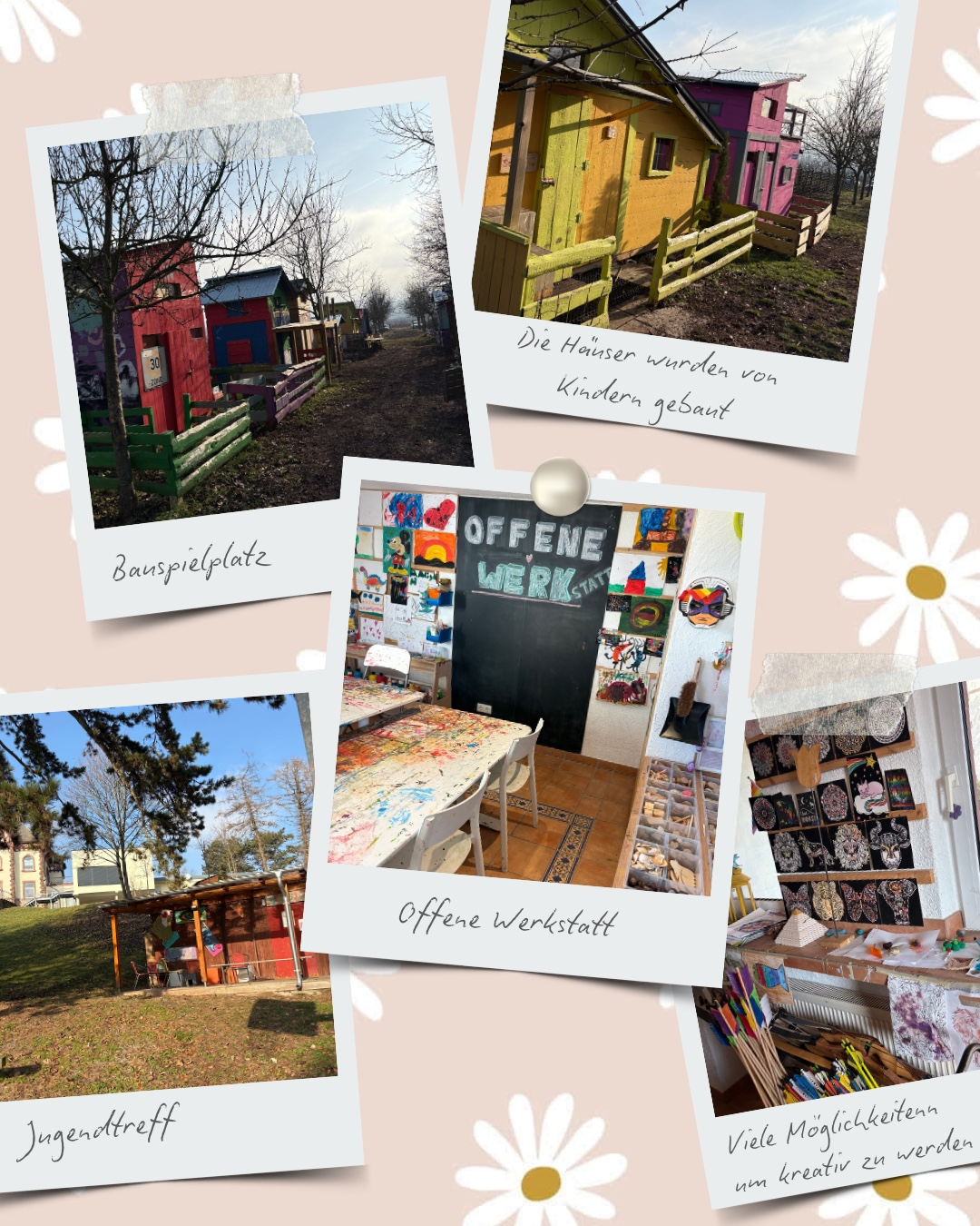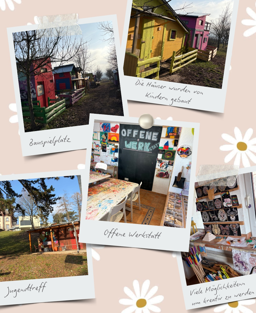 Neben einem großen Spielplatz gibt es dort auch einen Bauspielplatz, auf dem sich die Kinder für ein Grundstück bewerben können, um dort mit Unterstützung ihr eigenes kleines Haus zu bauen. Für kleinere, kreative Projekte steht eine offene Werkstatt zur Verfügung, in der scheinbar alles möglich ist und kaum Wünsche offenbleiben. Für die Jugendlichen gibt es zudem einen Jugendtreff, der von ihnen selbst gestaltet und eingerichtet wurde.