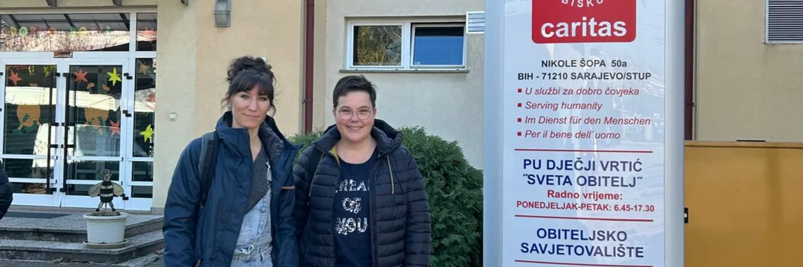 „Im Rahmen unseres Auslandspraktikums hatten wir die Möglichkeit, drei sehr unterschiedliche Arbeitsbereiche in Sarajevo kennenzulernen: den Caritas-Kindergarten, den Verein OAZA für Menschen mit Behinderung sowie einen Workshop im Jugendzentrum mit Jugendlichen im Alter von 10 bis 14 Jahren. Sehr schnell haben wir gemerkt, dass die pädagogische Arbeit hier anders ist als in Deutschland. In unserer Heimat wird viel kindorientierter und partizipativer mit Kindern gearbeitet. In Sarajevo erleben wir eine andere Kultur und eine andere Haltung, was uns bewusstgemacht hat, wie gut wir es zu Hause in vielen Bereichen haben. Trotzdem wurden wir von den kleinen Kindern sofort akzeptiert und herzlich aufgenommen, was für uns ein besonders schöner Moment war. Besonders schön war auch der Austausch mit vier weiteren deutschen Freiwilligen, die ebenfalls hier arbeiten. Der Kontakt zu ihnen hat uns sehr geholfen, weil wir uns sehr gut verstanden haben und unsere Erfahrungen teilen konnten“.