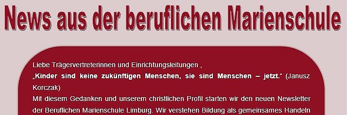 In den kommenden Newslettern haben Sie die Möglichkeit auf Ihre Einrichtung aufmerksam zu machen: Ob Anregungen für Angebote, besondere Erlebnisse in Ihrer Einrichtung, Erkenntnisse aus der Praxis etc. Der Kreativität sind keine Grenzen gesetzt! Senden Sie Ihren Beitrag an holzberg.l@marienschule-limburg.de.Wir freuen uns!